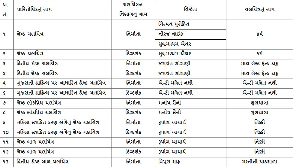 વર્ષ-2023ના સમયગાળા દરમિયાન સિનેમાગૃહોમાં પ્રદર્શિત થયેલા ગુજરાતી ચલચિત્રો માટે રાજ્ય સરકાર દ્વારા વિવિધ 46 કેટેગરી પૈકી 40 કેટેગરીમાં પ્રોત્સાહક રકમ અને પારિતોષિક જાહેર કરવામાં આવ્યા છે. આગામી સમયમાં રાજ્ય સરકાર દ્વારા પારિતોષિક વિજેતા કલાકાર-કસબીઓનો સન્માન સમારોહ યોજવામાં આવશે.