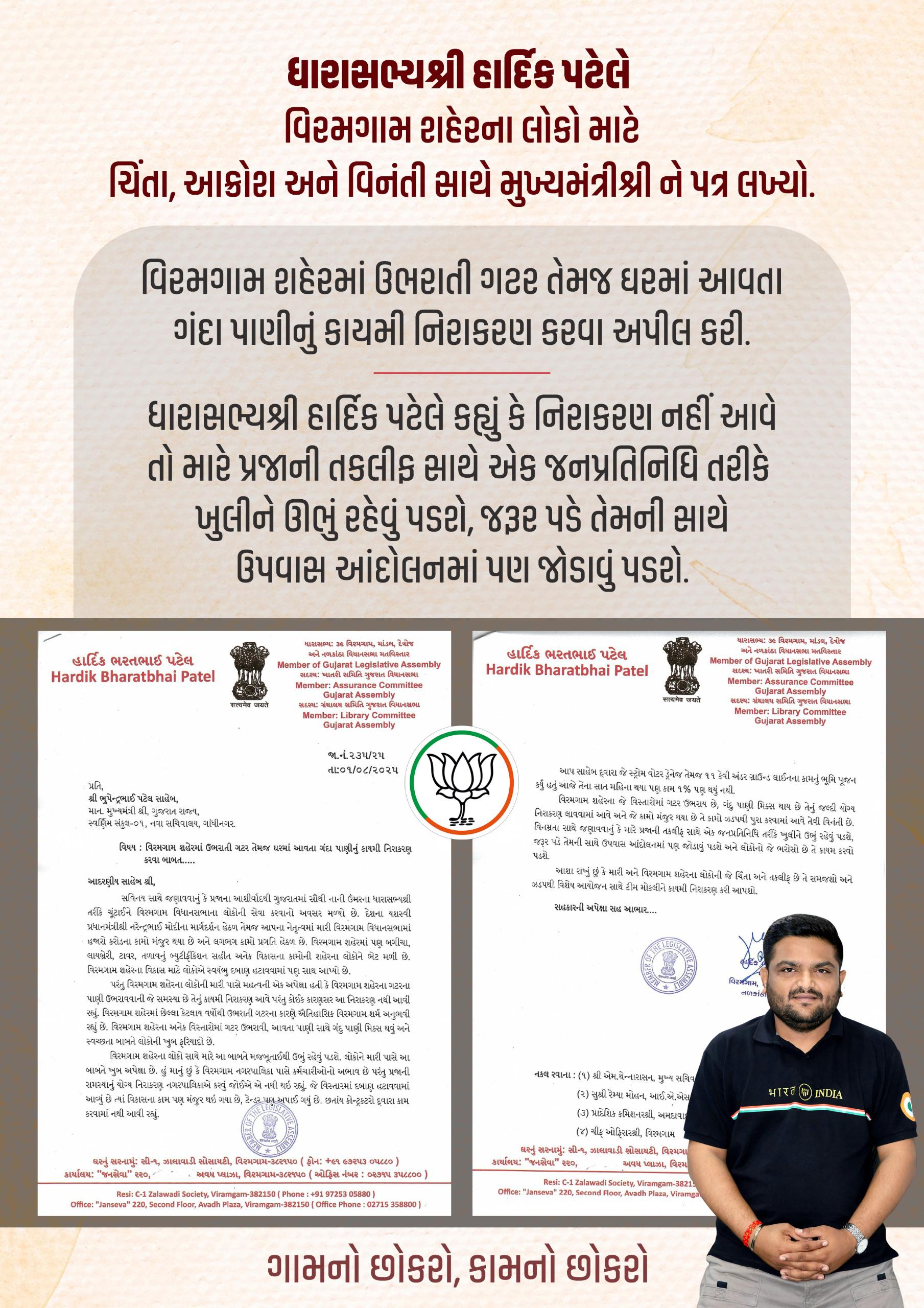 આંદોલનમાંથી નેતા અને ધારાસભ્ય બનેલા વિરમગામનાં ભાજપનાં ધારાસભ્ય હાર્દિક પટેલે વિરમગામનાં લોકોની સમસ્યાનું નિવારણ લાવવા માટે મુખ્યમંત્રી ભૂપેન્દ્ર પટેલને સંબોંધીને પત્ર લખ્યો છે. આ પત્રમાં વિનંતી અને ચિમકી બંને સૂર જોવા મળે છે.