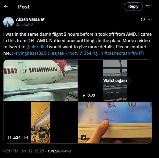 I was in the same damn flight 2 hours before it took off from AMD. I came in this from DEL-AMD. Noticed unusual things in the place.Made a video to tweet to @airindia i would want to give more details. Please contact me. @flyingbeast320 @aajtak @ndtv @Boeing_In #planecrash #AI171 pic.twitter.com/TymtFSFqJo