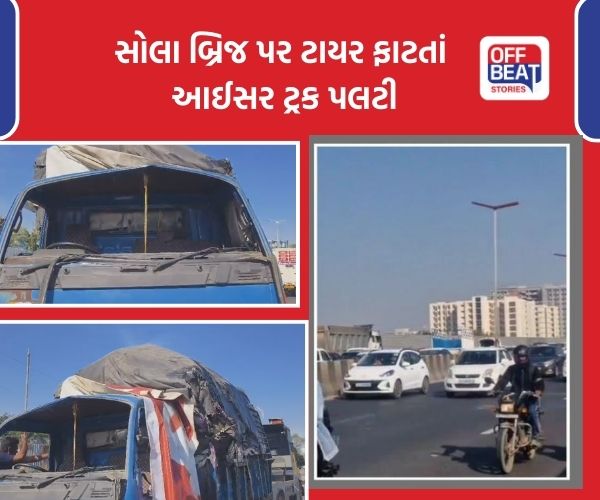 મળતી માહિતી અનુસાર વહેલી સવારે એક આઈસર ટ્રક સામાન ભરેલી હાલતમાં સોલા બ્રિજ પરથી પસાર થઈ રહી હતી. ત્યારે અચાનક ધડાકાભેર તેનો ટાયર ફાટ્યો હતો. ટાયર ફાટતાં જ ટ્રકચાલકે સ્ટીયરિંગ પરથી કાબૂ ગુમાવ્યો અને ટ્રક બ્રિજની વચ્ચોવચ પલટી મારી ગઈ હતી.