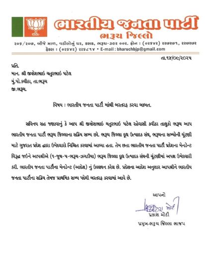 Dudhdhara Dairy Election : ભરૂચની દૂધધારા ડેરીની ચૂંટણી હવે મોટા રાજકીય નાટકનું કેન્દ્ર બની ગયું છે. ખાસ કરીને ભાજપમાં મેન્ડેટને લઈને ઉથલપાથલ જોવા મળી રહી છે. ભારતીય જનતા પાર્ટી દ્વારા મેન્ડેટ અપાયું છે તેવા ઉમેદવારો સામે ભાજપના લોકોએ ચૂંટણીમાં ફોર્મ ભર્યા છે,એટલે કે, પક્ષના કેટલાક નેતાઓએ મેન્ડેટના નિર્ણય સામે બળવો કર્યો છે.