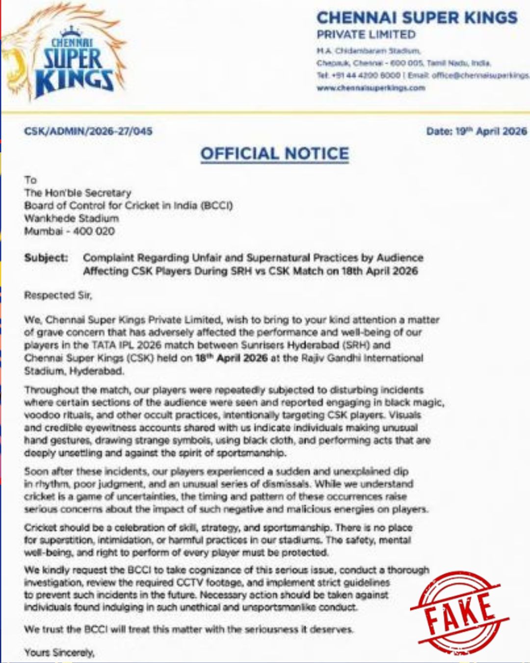 સોશિયલ મીડિયા પર વાયરલ થયેલો ચેન્નાઈ સુપર કિંગ્સનો ફરિયાદ પત્ર સંપૂર્ણપણે એડિટ કરેલો અને નકલી સાબિત થયો છે. ફ્રેન્ચાઈઝી કે, BCCI તરફથી આવી કોઈ જ સત્તાવાર ફરિયાદ કરવામાં આવી નથી. આ મેચમાં હૈદરાબાદે ચેન્નાઈને 10 રનથી હરાવીને શાનદાર જીત નોંધાવી હતી, પરંતુ ચર્ચા રમત કરતા આ 'બ્લેક મેજિક' ની વધુ થઈ રહી છે.