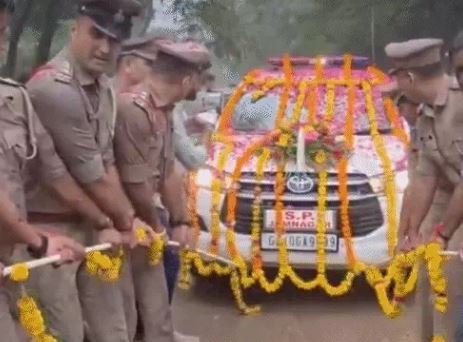 જામનગર SP પ્રેમસુખ ડેલુના વિદાય સમારંભમાં સાથી કર્મચારીઓએ ઢોલ નગારા વગાડી, ગુલાબની પાંખડી વરસાવી અને ગાડીને ફૂલોના દોરડાથી ખેંચી વિદાય આપી હતી.