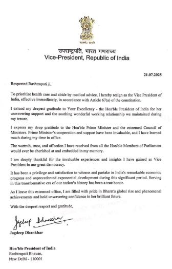ભારતના ઉપરાષ્ટ્રપતિ જગદીપ ધનખડે તાત્કાલિક અસરથી તેઓના પદ પરથી રાજીનામું આપી દીધું છે. રાષ્ટ્રપતિ દ્રૌપદી મુર્મુને સંબોધિત પત્રમાં, તેમણે સ્વાસ્થ્ય કારણો અને તબીબી સલાહનો ઉલ્લેખ કરીને બંધારણની કલમ 67(a) હેઠળ રાજીનામું આપી દીધું છે. રાષ્ટ્રપતિ મુર્મુને સંબોધિત રાજીનામામાં, જગદીપ ધનખડે લખ્યું છે કે , 'સ્વાસ્થ્યને પ્રાથમિકતા આપીને તબીબી સલાહનું પાલન કરીને, હું તાત્કાલિક અસરથી ભારતના ઉપરાષ્ટ્રપતિ પદ પરથી રાજીનામું આપી રહ્યો છું.' તેમણે રાષ્ટ્રપતિનો તેમના સહયોગ અને સૌહાર્દપૂર્ણ સંબંધો બદલ આભાર માન્યો. તેમણે પ્રધાનમંત્રી અને મંત્રી પરિષદનો પણ તેમના સહયોગ અને માર્ગદર્શન બદલ આભાર માન્યો.