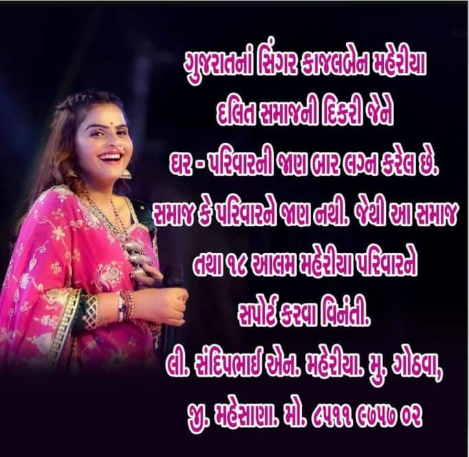 છેલ્લા 24 કલાકથી સોશિયલ મીડિયા પ્લેટફોર્મ્સ જેવા કે ફેસબુક અને ઇન્સ્ટાગ્રામ પર એક પોસ્ટ વાયુવેગે પ્રસારિત થઈ રહી છે. આ પોસ્ટમાં દાવો કરવામાં આવ્યો છે કે કાજલ મહેરિયાએ પરિવાર કે સમાજની કોઈપણ પ્રકારની સંમતિ વિના, ગુપ્ત રીતે લગ્નનો નિર્ણય લઈ લીધો છે. મળતી માહિતી મુજબ, આ પોસ્ટ મહેસાણા જિલ્લાના ખેરાલુ તાલુકાના ગોઢવા ગામના રહીશ સંદીપભાઈ એન. મહેરિયા દ્વારા શેર કરવામાં આવી હોવાનું ચર્ચાઈ રહ્યું છે.આ પોસ્ટમાં ગંભીર આક્ષેપો કરતા લખવામાં આવ્યું છે કે, કાજલ મહેરિયાના આ પગલાથી તેમનો પરિવાર સંપૂર્ણપણે અજાણ છે અને આ નિર્ણયથી પરિવારને ઊંડો આઘાત લાગ્યો છે. સોશિયલ મીડિયા પર આ પોસ્ટ બાદ સમાજના લોકોમાં અલગ-અલગ મતમતાંતર જોવા મળી રહ્યા છે. જોકે, આ આક્ષેપોમાં કેટલી હકીકત છે તેની સત્તાવાર પુષ્ટિ હજુ સુધી સિંગર કે તેમના પ્રતિનિધિ દ્વારા કરવામાં આવી નથી.
