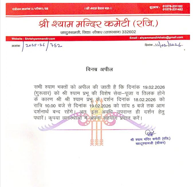 રાજસ્થાનના સુપ્રસિદ્ધ ધાર્મિક સ્થળ એવા ખાટું શ્યામ મંદિરમાં દરરોજ હજારોની સંખ્યામાં શ્રદ્ધાળુઓ ઉમટી પડતા હોય છે. જો તમે પણ આગામી દિવસોમાં બાબા શ્યામના દર્શન માટે જવાનું આયોજન કરી રહ્યા હોવ તો મંદિર કમિટી દ્વારા જાહેર કરવામાં આવેલી નવી સમય સારણી જાણી લેવી અત્યંત આવશ્યક છે. શ્રી શ્યામ મંદિર કમિટીના જણાવ્યા અનુસાર વિશેષ પૂજા અને ધાર્મિક વિધિઓને કારણે 18 અને 19 February 2026 ના રોજ મંદિરના કપાટ ભક્તો માટે અમુક કલાકો સુધી બંધ રાખવામાં આવશે.