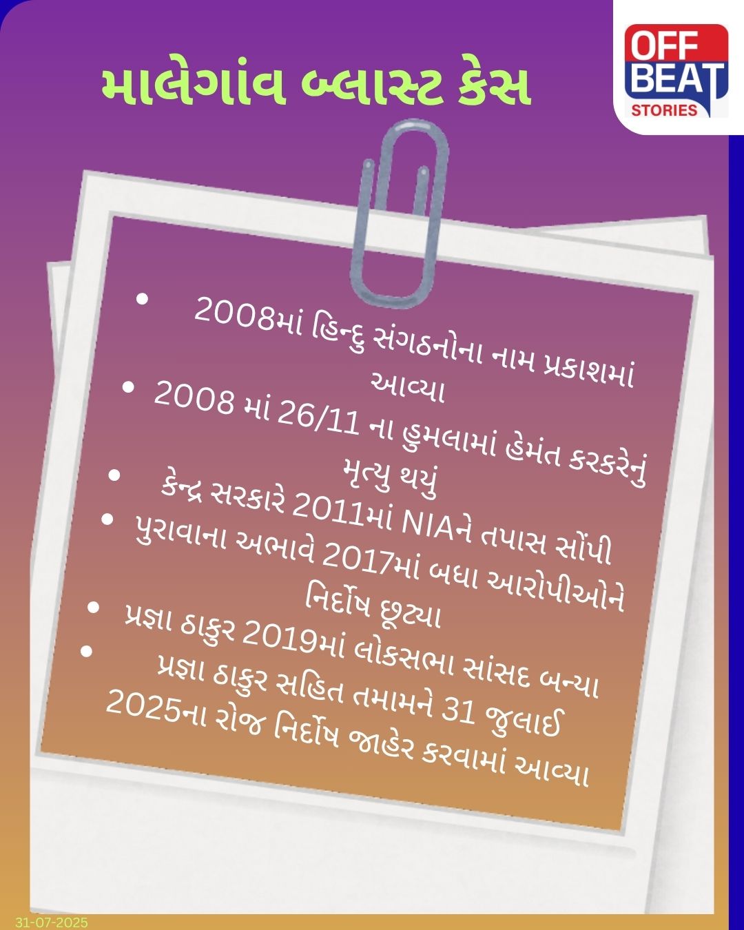 મહારાષ્ટ્રના માલેગાંવમાં 29 સપ્ટેમ્બર 2008ના રોજ બોમ્બ વિસ્ફોટ થયા હતા. આ વિસ્ફોટ રમઝાન મહિનામાં થયો હતો. એક વિસ્ફોટ મસ્જિદ પાસે અને બીજો બજારમાં કરવામાં આવ્યો હતો. જેમાં 6 લોકો માર્યા ગયા હતા અને લગભગ 90થી વધુ લોકો ઘાયલ થયા હતા. અગાઉ આ હુમલામાં આતંકવાદી સંગઠનની સંડોવણીના અહેવાલો બહાર આવ્યા હતા, પરંતુ એક મોટરસાઇકલને કારણે આખી વાર્તા બદલાઈ ગઈ હતી. ભૂતપૂર્વ સાંસદ પ્રજ્ઞા ઠાકુર અને કર્નલ પુરોહિત સહિત ઘણા લોકોના નામ સામે આવ્યા હતા. જાણો છેલ્લા 17 વર્ષથી ચાલી રહેલા આ કેસનું ઘટનાક્રમ શું છે.