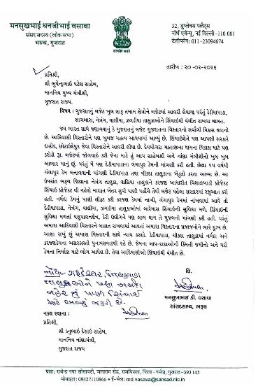 નર્મદા જિલ્લોના આદિવાસી વિસ્તારોમાં સિંચાઈ માટે બજેટમાં કોઈ સ્પષ્ટ આયોજન ન થતા સાંસદ મનસુખ વસાવા નારાજગી વ્યક્ત કરી છે. તેમણે ભૂપેન્દ્ર પટેલને પત્ર લખી નર્મદા જિલ્લાના ગરુડેશ્વર, સાગબારા અને ડેડીયાપાડા વિસ્તારોમાં સિંચાઈ માટે તાત્કાલિક પગલાં ભરવાની રજૂઆત કરી છે.