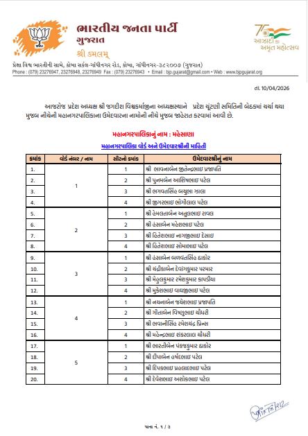 ગુજરાતની પાલિકા ચૂંટણીમાં ભાજપ સતત બદલાવની રાજનીતિ અપનાવી રહ્યું છે. મહેસાણા મહાનગરપાલિકા માટે ઉમેદવારોની મોડી સાંજે જાહેર થયેલી યાદી એનું તાજું ઉદાહરણ છે. ‘નો-રિપીટ’ થિયરી અને નવા ચહેરાઓ પર ભાર મૂકીને ભાજપે આ વખતે પરંપરાગત રાજકારણથી અલગ દિશામાં પગલું ભર્યું છે, જેના કારણે સ્થાનિક રાજકારણમાં ગરમાવો આવી ગયો છે.