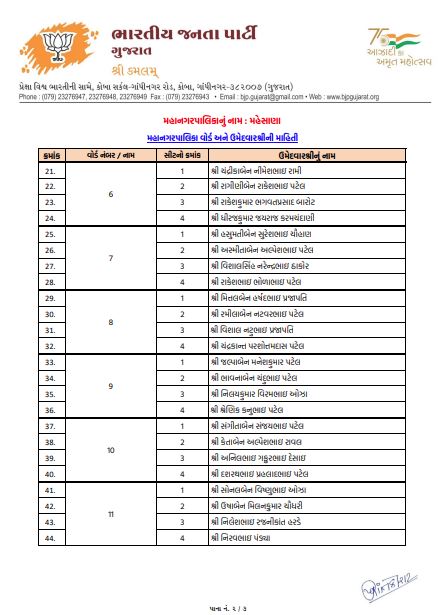 ભાજપે ગત ટર્મના સભ્યોમાંથી માત્ર 9 નગરસેવકોને જ ફરી તક આપી છે, જે પોતે જ એક મોટો રાજકીય સંદેશ છે. રિપીટ થનારા નામોમાં ટીનભા ઠાકોર, દિનેશ પટેલ, દીપક પટેલ અને મિતલ પ્રજાપતિનો સમાવેશ થાય છે. મહિલા પ્રતિનિધિત્વમાં ભારતીબેન પંકજભાઈ ઠાકોર અને અસ્મિતાબેન અલ્પેશભાઈ પટેલને ફરી તક આપવામાં આવી છે. બાકીના મોટાભાગના જૂના ચહેરાઓને આ વખતે બહાર રાખવામાં આવ્યા છે.