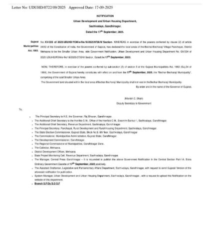 ઉલ્લેખનીય છે કે, રાજ્ય સરકારે મહેસાણા જિલ્લામાં આવેલા બેચર-બહુચરાજી ગામને નગરપાલિકાનો દરજ્જો આપવાની સત્તાવાર જાહેરાત કરી છે. આ પગલું ગુજરાત મ્યુનિસિપાલિટીઝ એક્ટ હેઠળ લેવામાં આવ્યું છે. ખાસ એ છે કે, આ વિસ્તારમાં યાત્રાધામ બહુચરાજી મંદિર હોવાની સાથે સુઝુકી જેવા ઓટોમોબાઇલ કંપનીઓનો હબ પણ ગણાય છે, ત્યારે આ વિસ્તારને વધુ વિકાસનો માર્ગ મોકળો થશે. આ ઔદ્યોગિકીકરણના કારણે આસપાસના વિસ્તારમાં વસ્તી અને આર્થિક ગતિવિધિઓ વધી છે.