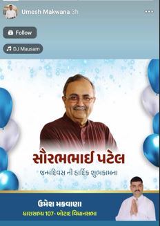 આમ આદમી પાર્ટીમાંથી ધારાસભ્ય ઉમેશ મકવાણાને સસ્પેન્ડ કરવામાં આવ્યા પછી તેમણે આમ આદમી પાર્ટીએ દૂરી બનાવી લીધી છે, પરંતુ ભાજપમાં ભળવાની ચર્ચા વચ્ચે ધારાસભ્ય ઉમેશ મકવાણાએ ભાજપના પૂર્વ મંત્રી અને નેતા સૌરભ પટેલને જન્મદિવસની શુભકામનાની ફેસબુક પર પોસ્ટ કરી છે. જે બાદ અનેક તર્ક વિતર્ક શરૂ થયા છે.