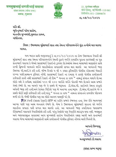 મનસુખ વસાવાએ કહ્યું કે, ''સમગ્ર મામલે તમામ વેપારીઓ ભેગા થયા અને કહ્યું કે, આજે તમારો વારો છે બાદમાં તેમણે પોલીસ ફરિયાદ કરવા પોલીસ સ્ટેશન ગયા પરંતુ ફરિયાદ લેવાઈ નહીં, ત્યારબાગ આ તમામ વેપારીએ ભેગા થઈ મને કોલ કરી સમગ્ર વાત જણાવી ત્યારે મેં પીઆઈને ફોન કર્યો પરંતુ તેમણે ગોળ ગોળ જવાબ આપ્યો ત્યારબાદ મેં મુખ્યમંત્રીને પત્ર લખતા સાથે ફરિયાદ લેવામાં આવી''.
