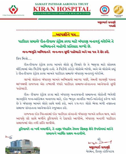 પાટીદાર સમાજના અગ્રણી અને પદ્મશ્રી સન્માનિત મથુર સવાણીએ આ અભિયાનને મજબૂત બનાવવા માટે પાટીદાર સમાજના લોકોને ખુલ્લેઆમ સમર્થન આપવા અપીલ કરી હતી. તેમણે સોશિયલ મીડિયામાં વીડિયો પોસ્ટ કરીને રીત-રિવાજ કંટ્રોલ કરવા માટે બંધારણ બનાવવાની જરૂરિયાત અંગે લોકોના અભિપ્રાયો માંગ્યા હતા. આ અપીલને સમાજમાંથી જોરદાર પ્રતિસાદ મળ્યો છે અને મોટી સંખ્યામાં લોકોએ પોતાના વિચારો અને સૂચનો રજૂ કર્યા છે.