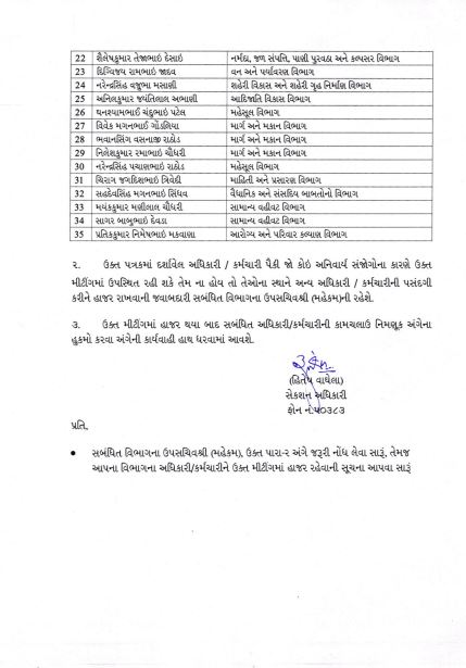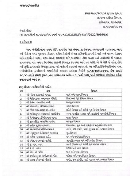 મંત્રીના હોદ્દા ગ્રહણ કર્યા તારીખથી બે માસના સમયગાળા માટે અથવા નિયમિત સ્ટાફની નિમણૂક કરવામાં આવે ત્યાં સુધી, એ બે પૈકી જે વહેલું હોય ત્યાં સુધી કામચલાઉ અધિકારીઓની નિમણૂક કરવા માટે પસંદગી કરવામાં આવી છે. આ અધિકારી/કર્મચારીઓને મંત્રીઓના કાર્યાલયની કામગીરીથી અવગત કરાવવા તેઓને તા.17/10/2025ના રોજ એટલે કે, આવતીકાલે સવારે 10.00 કલાકે કમિટી રૂમ-1, નવા સચિવાલય બ્લોક નં.1, 4થો માળ, ખાતે મીટીંગમાં ઉપસ્થિત રહેવા જણાવવામાં આવ્યું છે.
