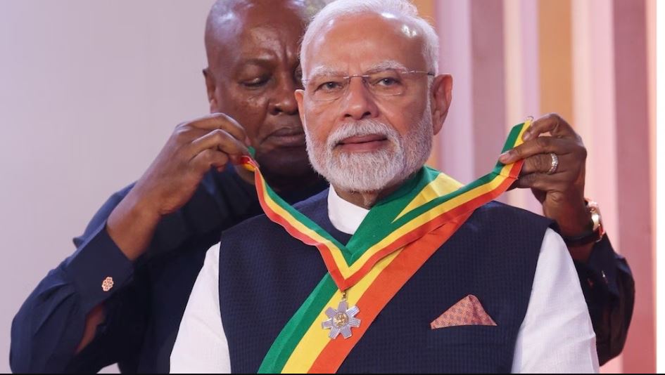 ભારતના વડાપ્રધાન નરેન્દ્ર મોદીને ઘાનાના રાષ્ટ્રીય સન્માન 'ધ ઓફિસર ઓફ ધ ઓર્ડર ઓફ ધ સ્ટાર ઓફ ઘાના'થી સન્માનિત કરવામાં આવ્યા છે. આ સન્માન તેમના અસાધારણ રાજનીતિક નેતૃત્વ અને વૈશ્વિક સ્તરે પ્રભાવશાળી નેતૃત્વ માટે આપવામાં આવ્યું છે. આ ઘટના ભારત અને ઘાના વચ્ચેના ગાઢ સંબંધોને વધુ મજબૂત બનાવે છે, જે સામાજિક, આર્થિક અને રાજકીય ક્ષેત્રોમાં સહયોગના આધારે ટકેલા છે.