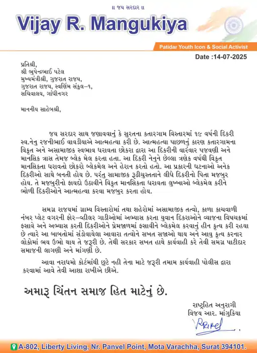 આ ઘટનાના એક દિવસ પૂર્વે એક પાટીદાર સમાજના અગ્રણી દ્વારા મુખ્યમંત્રીને લખેલો પત્ર સોશિયલ મીડિયા પર વાયરલ થયો હતો, જેમાં યુવતીને મળતી ધમકીઓ અને બ્લેકમેલ વિશે જણાવવામાં આવ્યું હતું. આ પત્ર હવે તપાસના કેન્દ્રબિંદુમાં છે અને પોલીસ દ્વારા એંગલથી તપાસ ચાલી રહી છે.