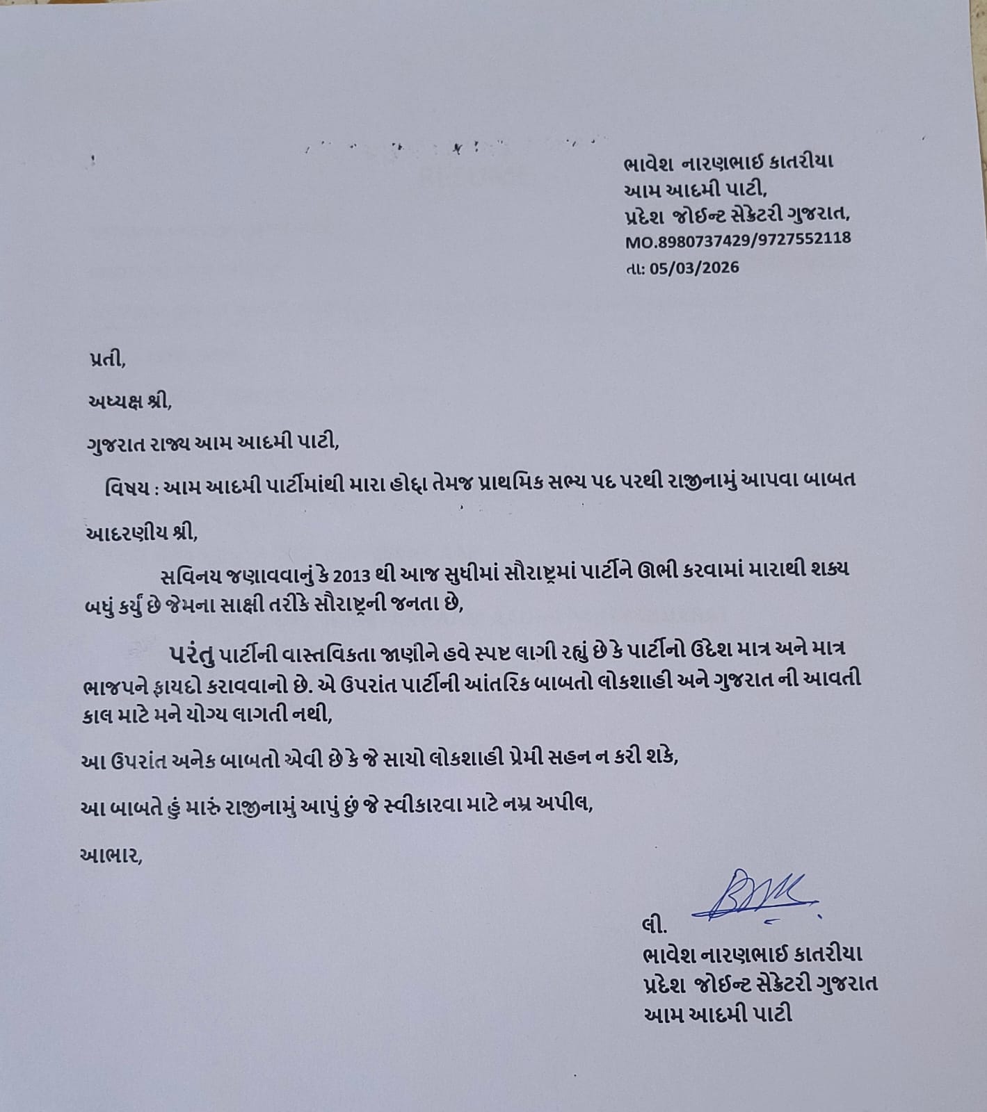 માહિતી મુજબ ભાવેશ કાતરિયાએ પોતાનું રાજીનામું AAPના પ્રદેશ નેતા ઇસુદાન ગઢવીને WhatsApp મારફતે મોકલ્યું હતું. રાજીનામા પત્રમાં તેમણે જણાવ્યું છે કે પાર્ટી હવે પોતાની મૂળ વિચારધારાથી ભટકી ગઈ છે અને એક કંપનીની જેમ ચલાવવામાં આવી રહી છે.
