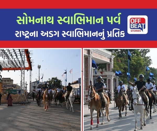 DIG રાજેન્દ્રસિંહ ચુડાસમાના નેતૃત્વમાં પાછલા ત્રણ દિવસથી સોમનાથ ખાતે આ અશ્વસવારો રિહર્સલ કરી રહ્યા છે. આજે સોમનાથ ખાતે યોજાયેલા રિહર્સલમાં અશ્વસાવરોના ' જય સોમનાથ - હર હર મહાદેવ' ના નાદ થી વાતાવરણ ગુંજી ઉઠ્યું હતું. સોમનાથ મહાદેવ મંદિર ભારતના આત્મસન્માન, સહનશીલતા અને પુનર્નિર્માણની અનોખી ગાથા રજૂ કરે છે. વારંવાર આક્રમણો છતાં સોમનાથ ફરી ફરી બેઠું થયું—આજ સુધી અડીખમ ઊભેલુ આ તીર્થ રાષ્ટ્રના અડગ સ્વાભિમાનનું પ્રતિક બની ગયુ છે. “સોમનાથ સ્વાભિમાન પર્વ” આ જ ઇતિહાસને આજની પેઢી સુધી જીવંત રીતે પહોંચાડવાનો પ્રયાસ છે.
