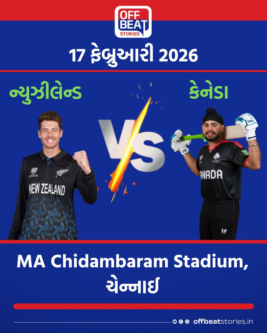 31 | ન્યુઝીલેન્ડ vs કેનેડા | MA Chidambaram Stadium, ચેન્નાઈ | સવારે 11:00 | મિચેલ સેન્ટનર/દિલપ્રીત બાજવા |