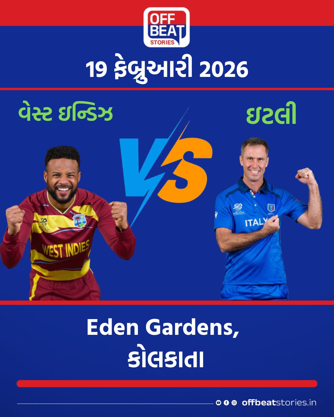 મેચ 1 : વેસ્ટ ઇન્ડિઝ vs ઇટલી (ઈડન ગાર્ડન્સ, કોલકાતા)