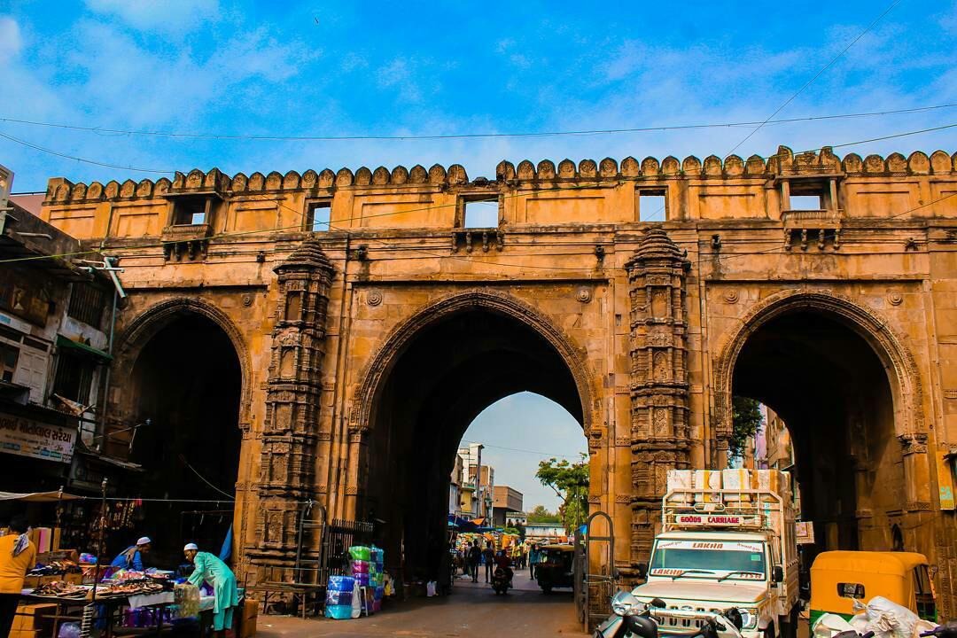લાલ દરવાજા માર્કેટની બિલકુલ બાજુમાં આવેલું 'ત્રણ દરવાજા' માત્ર એક સ્થાપત્ય નથી, પણ શહેરની ઓળખ છે. ઈસવીસન 1415માં બાદશાહ અહમદ શાહ દ્વારા નિર્મિત આ દરવાજો ઈન્ડો-ઈસ્લામિક સ્થાપત્ય શૈલીનું ઉત્કૃષ્ટ ઉદાહરણ છે. લોકવાયકા મુજબ, અહીં માતા લક્ષ્મીએ નગર છોડીને ન જવાનું વચન આપ્યું હતું, જેના પ્રતીક રૂપે અહીં આજે પણ એક અખંડ દીવો પ્રજ્વલિત છે.