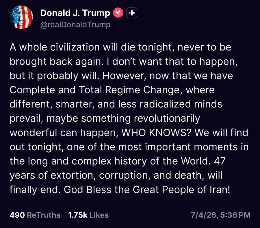 Middle East Conflict: અમેરિકી રાષ્ટ્રપતિ ડોનાલ્ડ ટ્રમ્પે ફરી એકવાર ઈરાનને સમજૂતી મુદ્દે આકરી ધમકી આપી છે. ટ્રમ્પે સ્પષ્ટ શબ્દોમાં જણાવ્યું છે કે જો સમયમર્યાદા પૂરી થતા પહેલા કોઈ ડીલ નહીં થાય, તો ઈરાનની આખી સભ્યતા આજે રાત્રે જ ખતમ થઈ જશે. પોતાના સોશિયલ મીડિયા પ્લેટફોર્મ 'ટ્રુથ સોશિયલ' પર તેમણે લખ્યું કે, “આજે રાત્રે એક આખી સભ્યતાનો અંત આવી શકે છે, જેને ક્યારેય પાછી લાવી શકાશે નહીં. હું આવું ઈચ્છતો નથી, પરંતુ કદાચ આવું થઈ શકે છે.