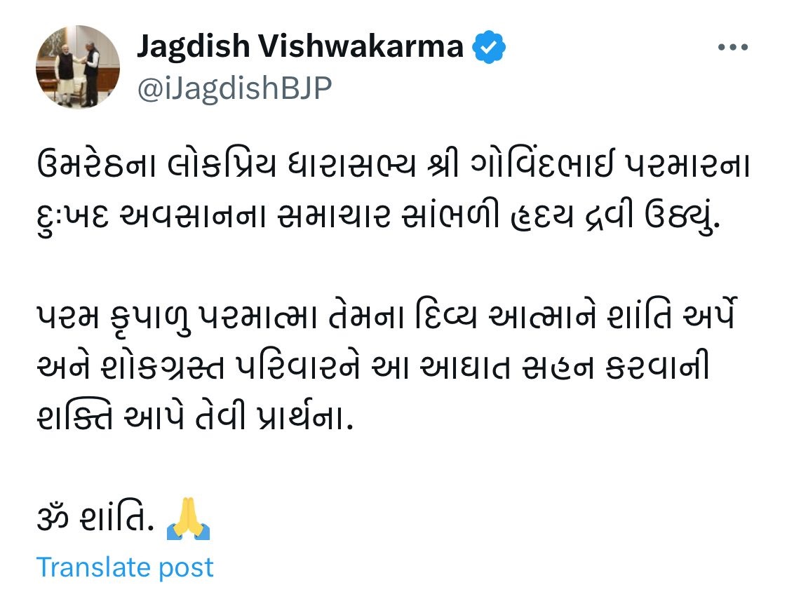 ગુજરાતના રાજકારણમાંથી એક અત્યંત દુઃખદ સમાચાર સામે આવ્યા છે. આણંદ જિલ્લાની ઉમરેઠ વિધાનસભા બેઠક પરથી ચૂંટાયેલા ધારાસભ્ય અને રાજ્ય સરકારના પૂર્વ મંત્રી ગોવિંદભાઈ રાયજીભાઈ પરમારનું નિધન થયું છે. વહેલી સવારે તેમને અચાનક હૃદયરોગનો હુમલો આવતા તબિયત લથડી હતી. સારવાર અર્થે તેમને તાત્કાલિક હોસ્પિટલ ખસેડવામાં આવ્યા હતા પરંતુ સારવાર દરમિયાન તેમણે અંતિમ શ્વાસ લીધા હતા. તેમના આકસ્મિક નિધનથી સમગ્ર ચરોતર પંથક અને ભારતીય જનતા પાર્ટીના કાર્યકરોમાં શોકની લહેર પ્રસરી ગઈ છે.