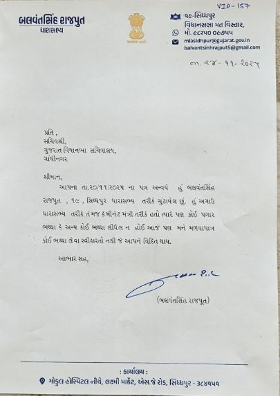 MLA Balwantsinh Rajput : રાજકીય ક્ષેત્રમાં સિદ્ધપુરના ધારાસભ્ય અને પૂર્વ મંત્રી બલવંતસિંહ રાજપૂતએ એક અનોખું ઉદાહરણ પૂરું પાડ્યું છે. ધારાસભ્ય તરીકે પગાર અને ભથ્થા આકારવાના મામલે સેક્શન ઓફિસરે જરૂરી પુરાવાની માંગણી કરતાં બલવંતસિંહ રાજપૂતે સ્પષ્ટ શબ્દોમાં જણાવ્યું છે કે તેઓ કોઈ પગાર કે ભથ્થો સ્વીકારતા નથી.