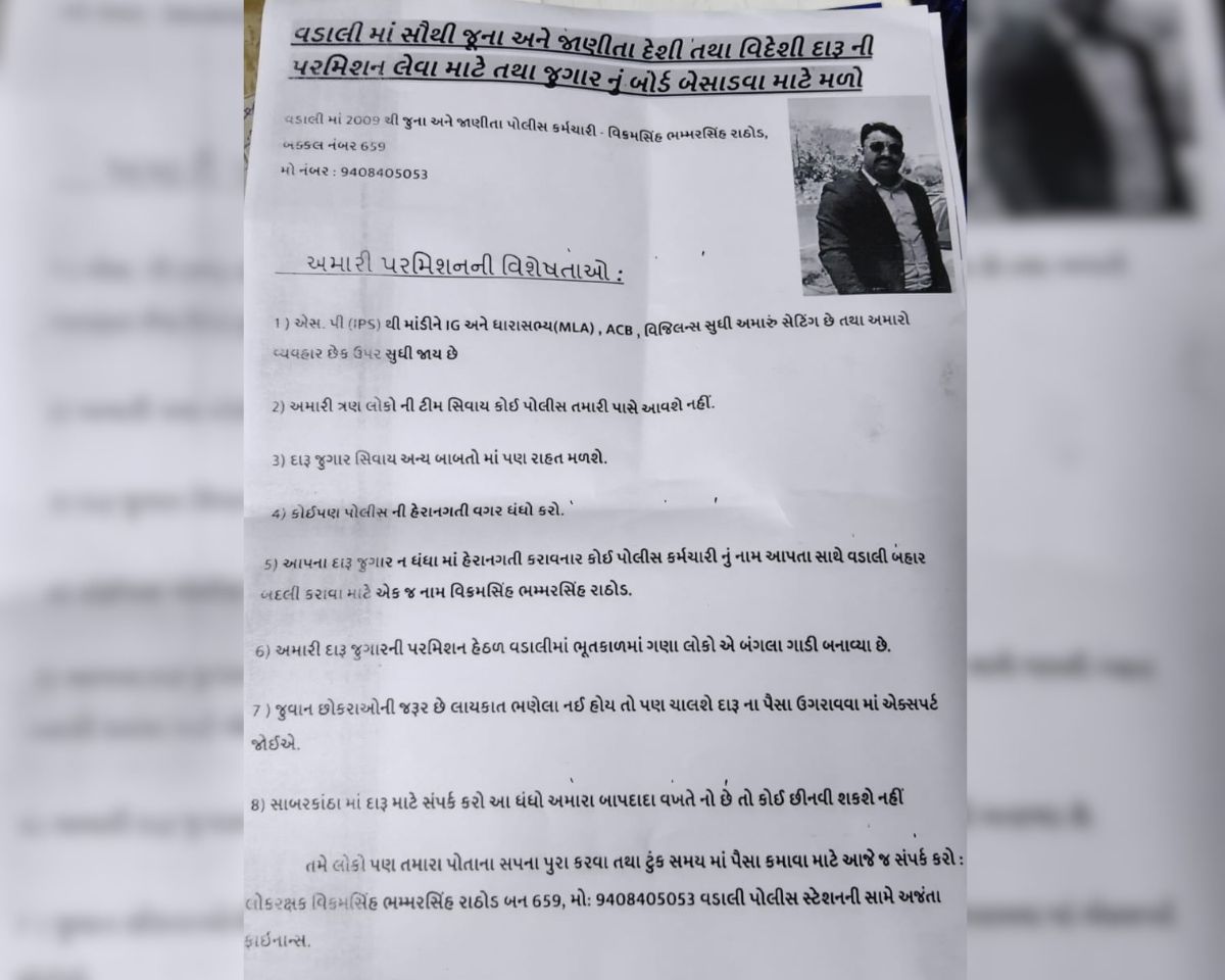આ પત્રિકામાં સૌથી આશ્ચર્યજનક બાબત એ છે કે, તેમાં પોરબંદરમાં ફરજ બજાવતા અને મૂળ વડાલીના વતની એવા એક પોલીસ કોન્સ્ટેબલની તસવીર અને મોબાઈલ નંબર છાપવામાં આવ્યો છે. પત્રિકામાં દારૂ અને જુગાર જેવી ગેરકાયદે પ્રવૃત્તિઓ માટે 'પરમિશન' અપાવવાની અને પોલીસ સેટિંગ હોવાની વાતો લખવામાં આવી છે. પ્રાથમિક દ્રષ્ટિએ આ લખાણ કોઈને વ્યક્તિગત રીતે અને પોલીસ તંત્રને સામાજિક રીતે બદનામ કરવાના ઈરાદે તૈયાર કરાયું હોય તેવું જણાય છે.