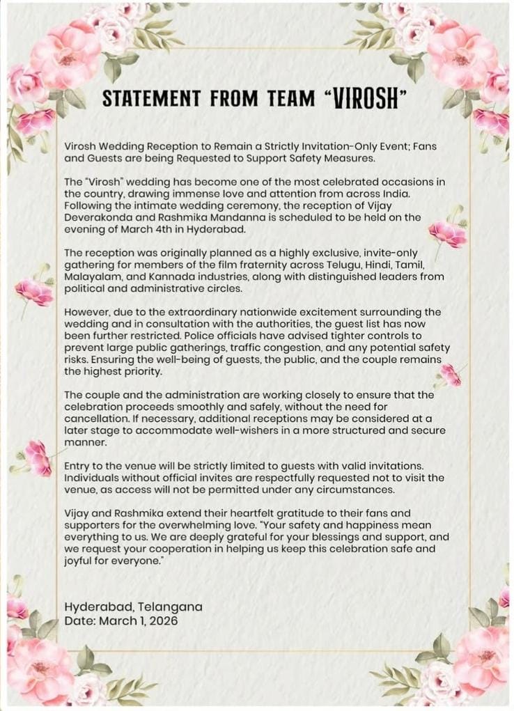 Rashmika-Vijay Reception: સાઉથ સુપરસ્ટાર વિજય દેવરકોંડા અને રશ્મિકા મંદાનાના લગ્નની ચર્ચાઓ વચ્ચે હવે તેમના ભવ્ય રિસેપ્શનની તૈયારીઓ તેજ થઈ ગઈ છે. ૨૬ ફેબ્રુઆરીના રોજ ઉદયપુરમાં અત્યંત ખાનગી રીતે લગ્ન કર્યા બાદ, આ નવદંપતી હવે ૪ માર્ચે હૈદરાબાદમાં એક શાનદાર વેડિંગ રિસેપ્શન યોજવા જઈ રહ્યું છે. રવિવારે જારી કરાયેલા સત્તાવાર નિવેદન અનુસાર, આ સેલિબ્રેશન મનોરંજન જગતના સિતારાઓથી ઝગમગી ઉઠશે. જોકે, હાઈ-પ્રોફાઈલ મહેમાનોની સુરક્ષાને ધ્યાનમાં રાખીને કપલે એક મોટો નિર્ણય લીધો છે. રિસેપ્શન વેન્યુ પર માત્ર તે જ લોકોને પ્રવેશ મળશે જેમની પાસે સત્તાવાર આમંત્રણ પત્ર હશે. સુરક્ષાના કારણોસર મહેમાનોની યાદી પણ મર્યાદિત રાખવામાં આવી છે, જેથી આ ખાસ સાંજને કોઈપણ ખલેલ વગર યાદગાર બનાવી શકાય.