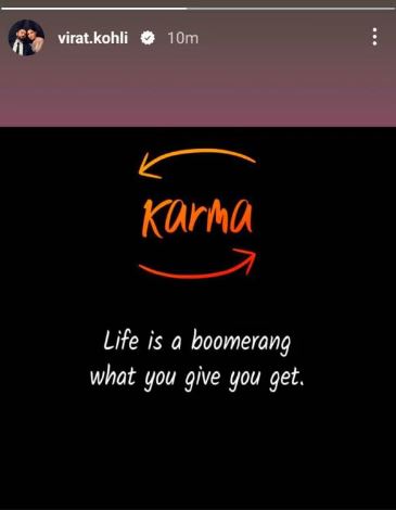 વિરાટ કોહલીની સ્ટોરી "Karma"વિરાટ કોહલીની સ્ટોરી પર લખેલું છે કે, "Karma" પોસ્ટમાં આગળ લખ્યું છે કે, "જીવન એક બૂમરેંગ છે, તમે જે આપો છો તે જ મેળવો છો." BCCI દ્વારા વિરાટ કોહલીને કેપ્ટનશીપ પરથી દૂર કર્યા પછી રોહિત શર્માને ભારતીય ટીમનો કેપ્ટન બનાવવામાં આવ્યો હતો. BCCI એ હવે રોહિતના સ્થાને શુભમન ગિલને કેપ્ટન તરીકે નિયુક્ત કર્યો છે.