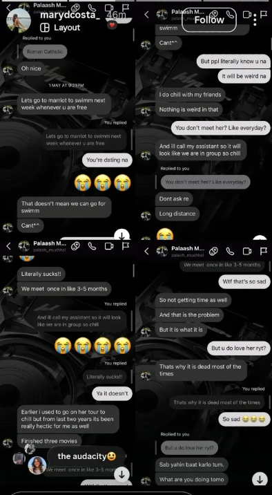 પરંતુ માત્ર એક જ દિવસ પછી, એટલે કે 23 નવેમ્બરે સાંજે, સોશિયલ મીડિયા પર ધડાધડ સ્ક્રીનશૉટ્સ વાયરલ થવા લાગ્યા. એક મહિલાએ પલાશ મુછલની સાથેની પોતાની ચેટના સ્ક્રીનશૉટ્સ પોસ્ટ કર્યા, જેમાં પલાશ તેને “બીચ પર મળીએ, સ્વિમિંગ કરીએ” જેવી વાતો કરી રહ્યો છે. સૌથી મોટો શોકર તો એ કે જ્યારે છોકરીએ પૂછ્યું કે “તારી ગર્લફ્રેન્ડ નથી?” ત્યારે પલાશે જવાબ આપ્યો: “અમારું તો લોંગ ડિસ્ટન્સ છે યાર, એ બેંગ્લોરમાં છે, હું મુંબઈમાં.”