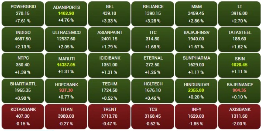 BSE ના ટોપ 30 શેરોમાંથી, ફક્ત પાંચ શેર 2% થી વધુ ઘટાડા સાથે બંધ થયા. બાકીના 25 શેરોમાં મજબૂત ઉછાળો જોવા મળ્યો. પાવરગ્રીડ જેવા શેર 7% થી વધુ, અદાણી પોર્ટ 4% થી વધુ અને મુકેશ અંબાણીના શેર 3% થી વધુ વધ્યા.