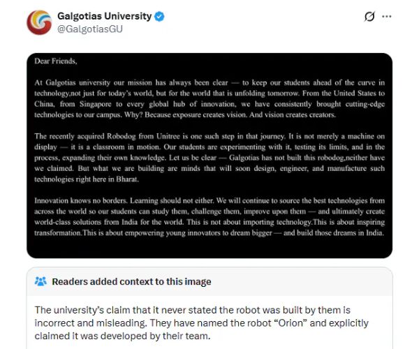 જોકે, X કમ્યુનિટિ નોટે આ દાવાનું ખંડન કર્યું, તેને "ભ્રામક" ગણાવ્યું, જેનાથી આયોજકો પર પગલાં લેવા માટે દબાણ વધ્યું. 'રોબોટ ડોગ' વાસ્તવમાં પ્રખ્યાત ચીની રોબોટિક્સ કંપની, 'Unitree' નું "Go2" મોડેલ છે. આ રોબોટની ઓનલાઈન કિંમત લગભગ 2 થી 3 લાખ રૂપિયા છે.